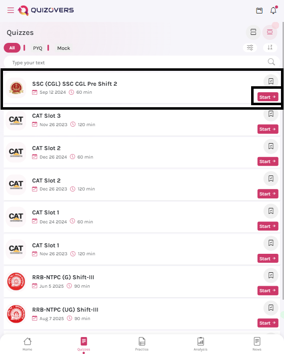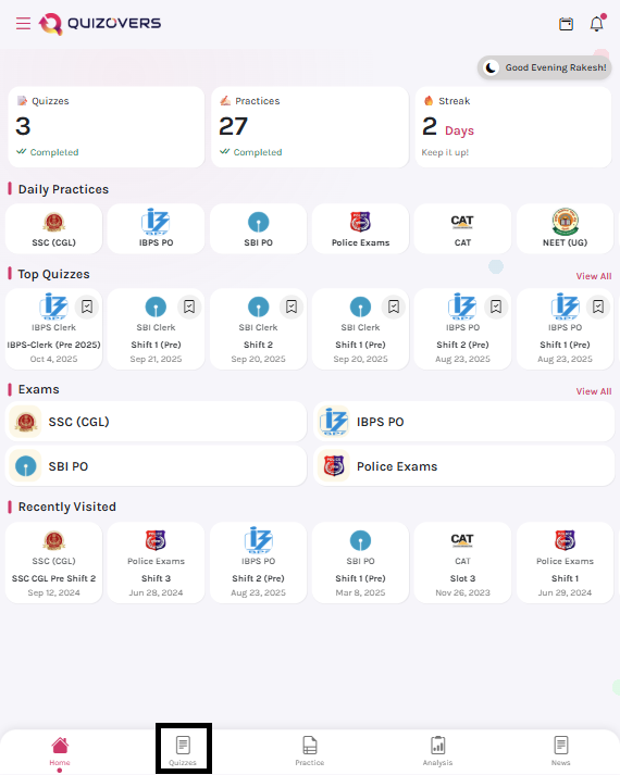 The second icon in the bottom navigation bar takes you to the Quizzes section. This is your hub for all Mock Tests and Previous Year Papers (PYPs).