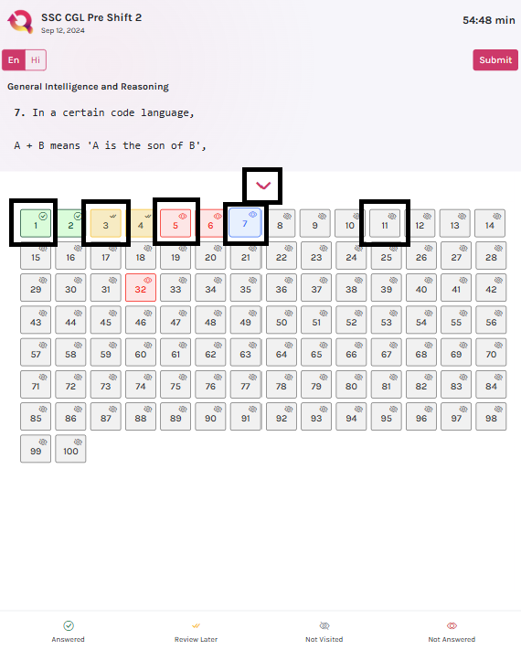 Tap the up arrow to open the full question palette with colour-coded status for every question.
