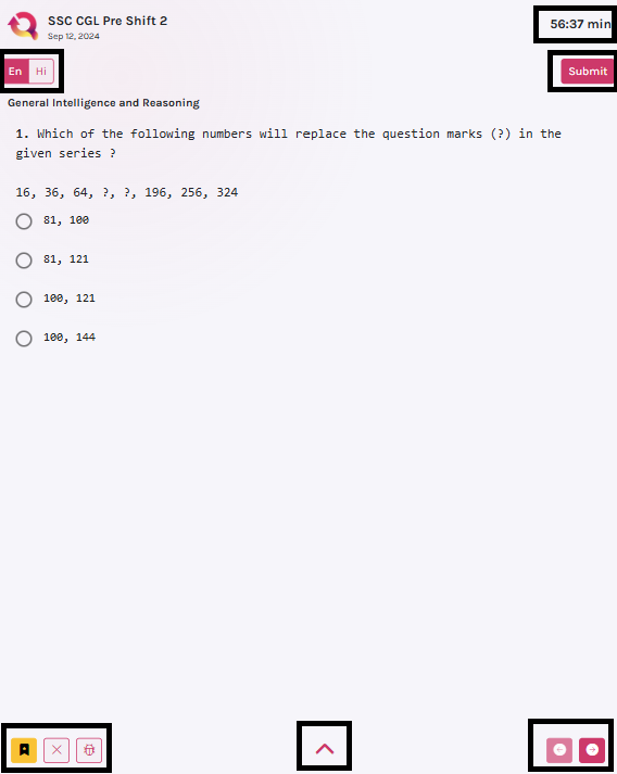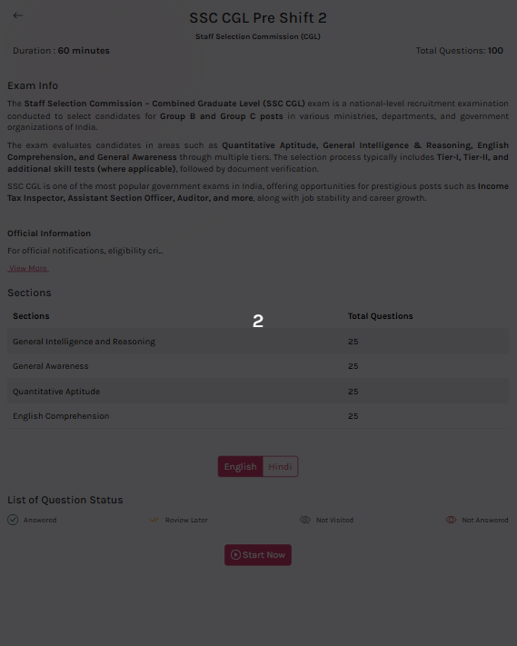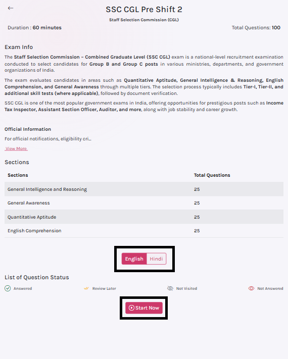 Switch between Hindi and English mid-quiz for any supported exam.