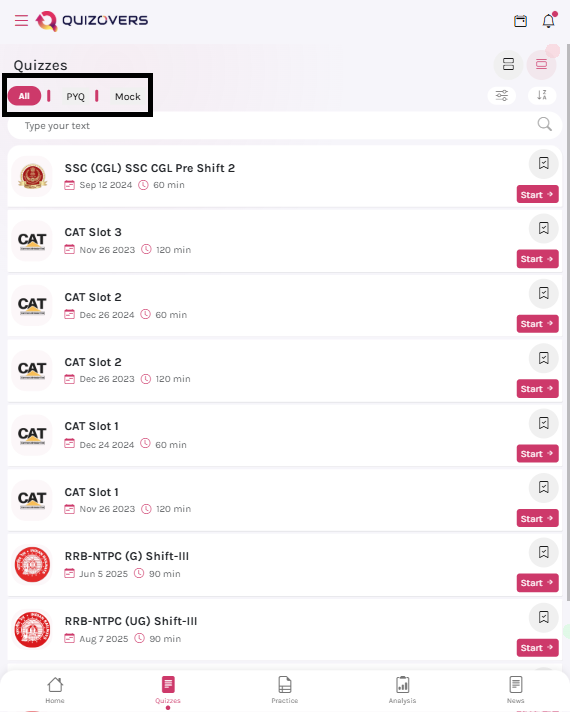 By default, all quizzes are shown. Use the filter tabs at the top to switch between Mock Tests and PYPs. The list updates instantly — no page reload needed.